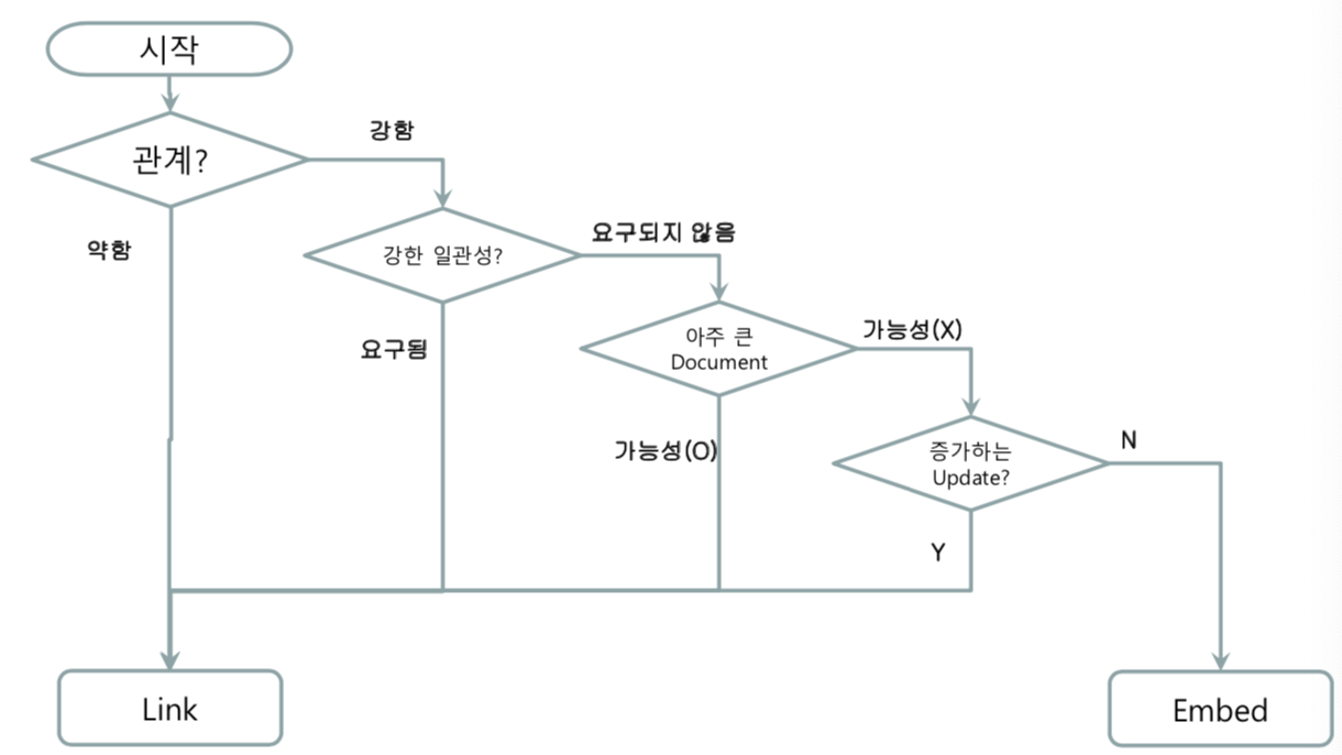 ■ Linked Document는 기존 관계형 데이터베이스 처럼 비정규화하지 않고, 두개의 테이블로 분리시키는 방법이다. 제약조건이 없다는 점을 제외하면 관계형 데이터베이스와 동일하다고 볼 수 있다.