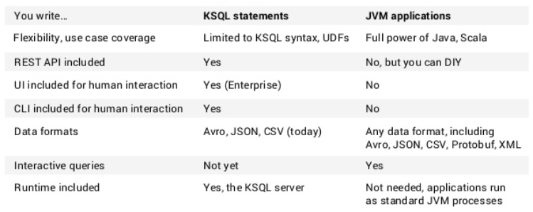 가장큰 차이는 KSQL은 SQL문법을 쓰며, KSQL server가 존재해야한다는 것이고 Kafka stream은 JVM application으로서 따로 process가 작동한다는 점이다. 이는 사용성에 있어서 매우 큰 차이를 나타낸다. KSQL을 운영하기 위해서 server을 따로 구동시키고 운영이 필요하다는 점은 운영 부담이 늘어난다는 단점이 될 수 있다. 물론 Kafka stream으로 개발한 JVM application을 따로 운영하는것도 운영 부담중 하나이므로 기업의 환경이나 요구사항에 맞게 사용하는 것이 좋을 것으로 보인다.
