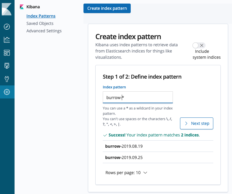 Elasticsearch에 수집된 document들의 index pattern을 정의해야합니다. Kibana를 통해 아래와 같이 패턴을 정의할 수 있습니다.