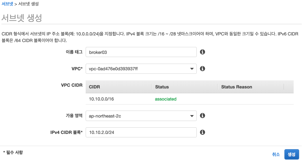 - broker03 : MSK_TEST_VPC, ap-northeast-2a, 10.10.2.0/24(IPv4 CIDR 블록)