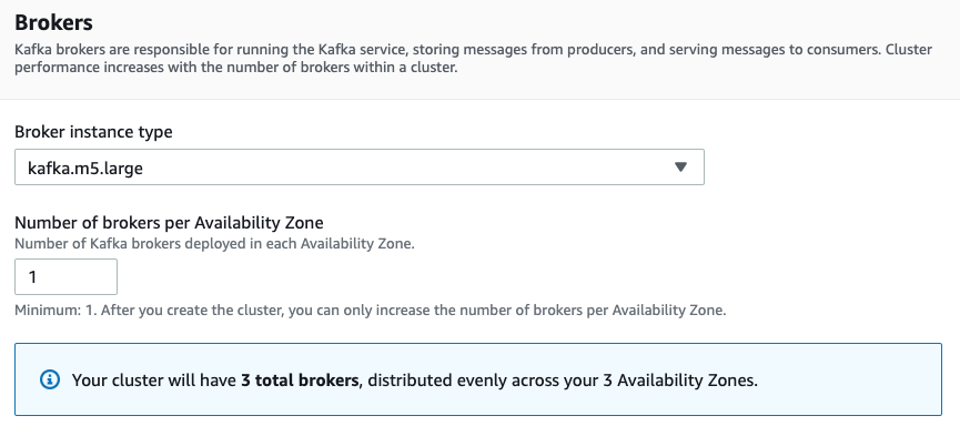 이번 설정에서는 Kafka broker가 운영되는 broker의 instance(서버)의 스펙과 개수를 정할 수 있습니다.