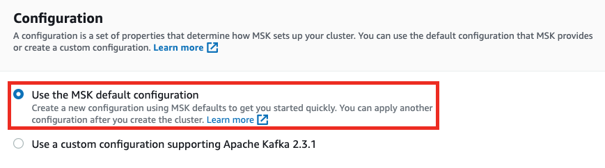 이번 설정에서는 Kafka configuration을 설정할 수 있습니다. default설정으로 운영할 수도 있고 혹은 2.3.1 kafka에 해당하는 configuration을 조합하여 사용할 수도 있습니다. 이번에는 테스트용도이므로 따로 추가/변경 설정을 하지 않고 default configuration을 사용하도록 하였습니다.
