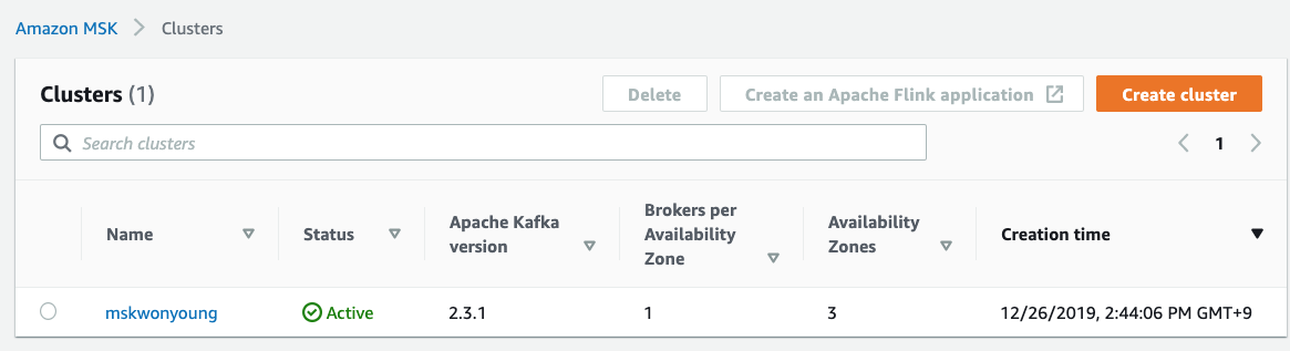 $ bin/kafka-topics --create --zookeeper z-2.mskwonyoung.ap69b5.c4.kafka.ap-northeast-2.amazonaws.com:2181,z-1.mskwonyoung.ap69b5.c4.kafka.ap-northeast-2.amazonaws.com:2181,z-3.mskwonyoung.ap69b5.c4.kafka.ap-northeast-2.amazonaws.com:2181 \