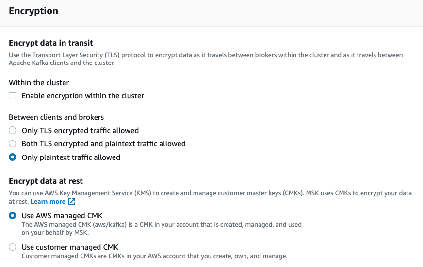 MSK와 통신할때 TLS(Transport Layer Security) 프로토콜을 사용할 것인지에 대한 설정을 진행할 수 있습니다. 운영상황에 맞게 설정하시면 됩니다.