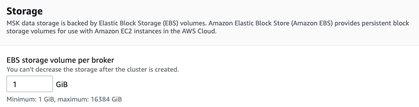 Kafka를 운영함에 있어 Storage의 중요성은 빼놓을 수 없습니다. Topic의 rention기간에 따라 storage설정을 진행하시면 됩니다. 최소 1GB에서 최대 16384GB까지 설정할 수 있습니다. 이 설정을 통해 각 broker는 Amazon EBS를 발급받게 됩니다.