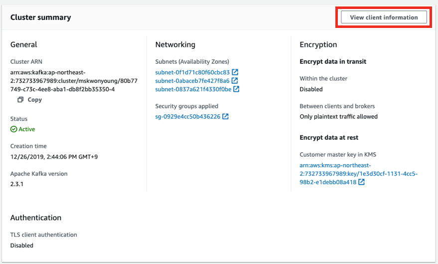 Producer, Consumer와 통신하기 위해서는 broker 정보가 필요합니다. Bootstrap broker url 정보는 MSK manage page에서 확인 할 수 있습니다.