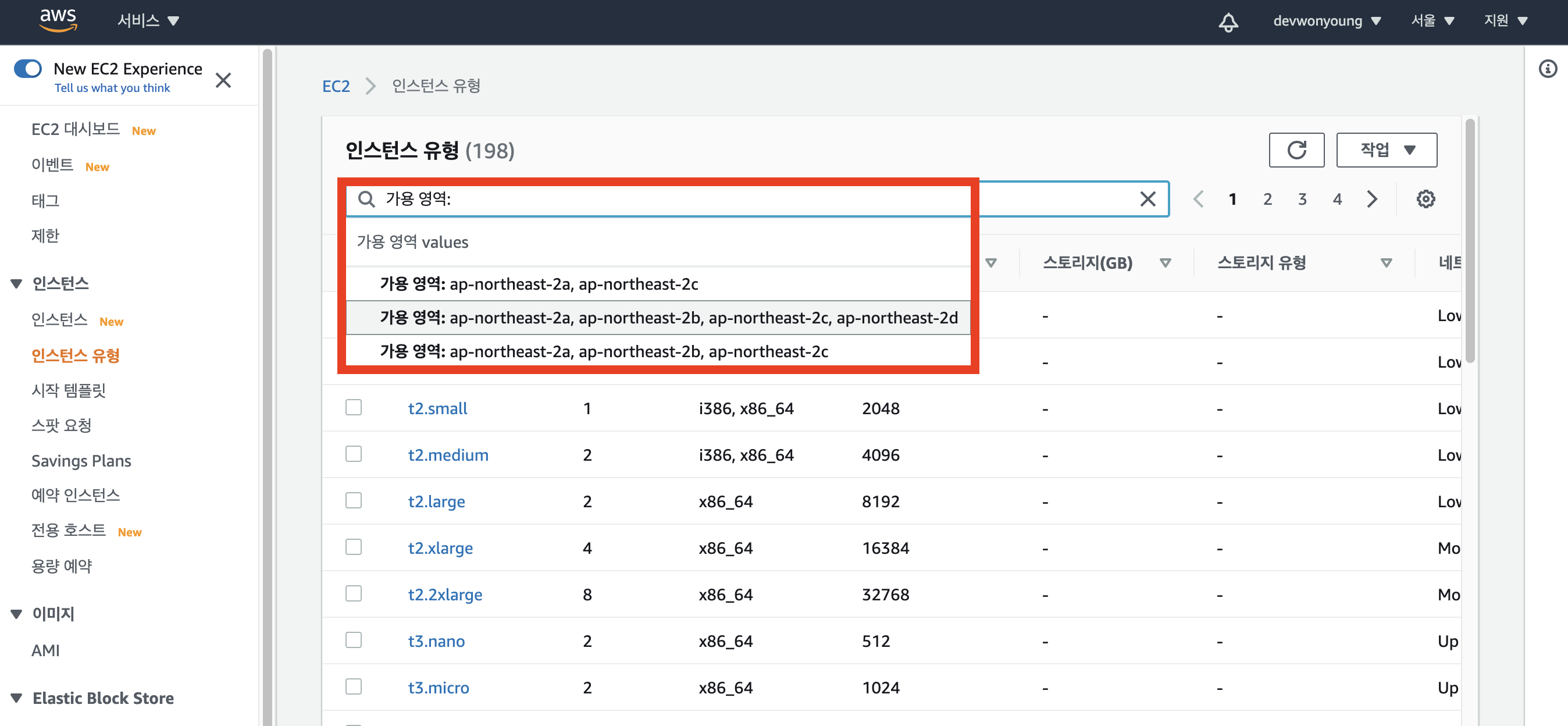t2.micro는 4개 가용영역에서 지원하지 않는 것을 알 수 있습니다. t3.nano, t3.micro를 비롯한 여러 인스턴스가 4개 가용영역 모두에서지원하는 것을 확인할 수 있습니다.