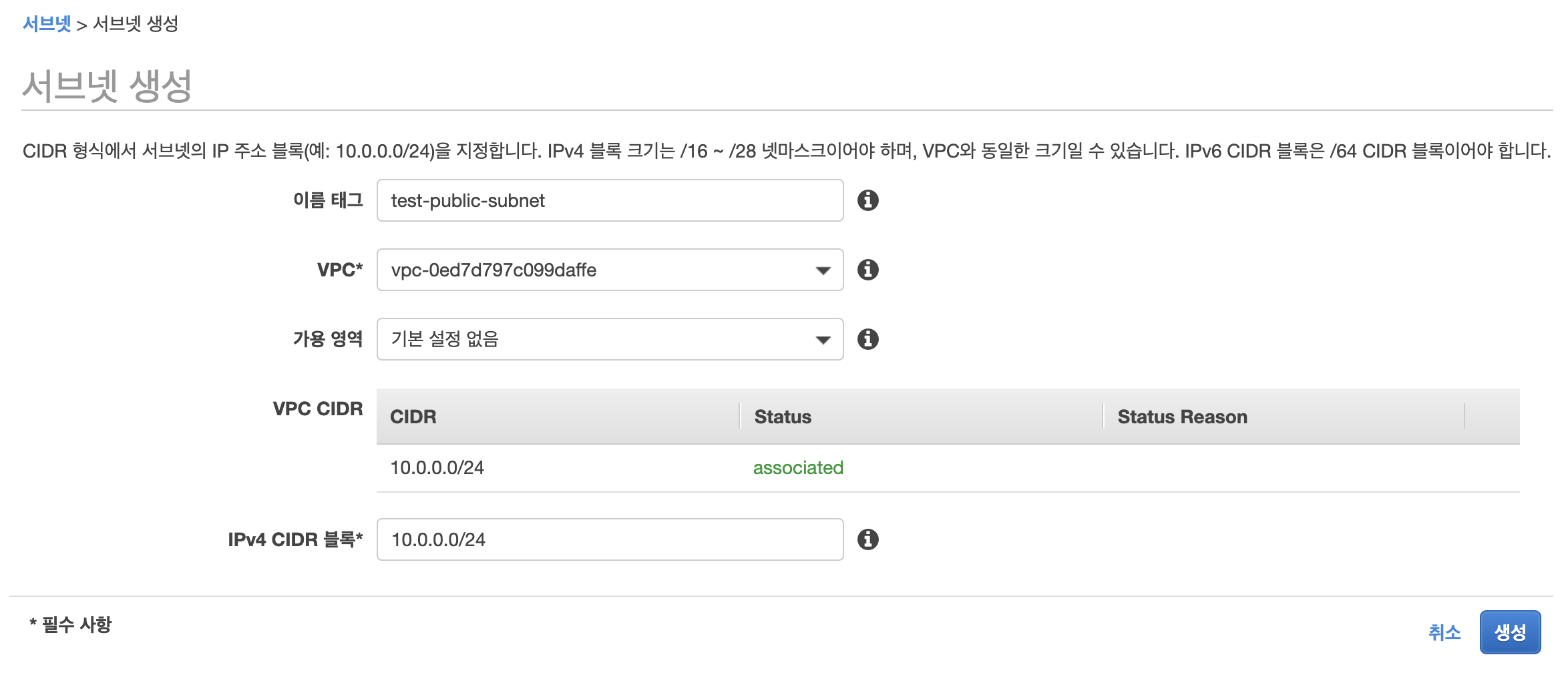 생성한 VPC에 속한 서브넷을 생성합니다.
