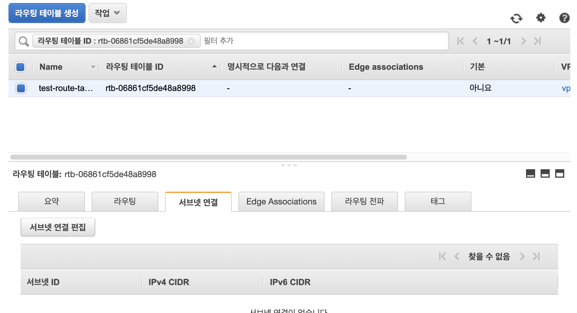 라우팅테이블에 서브넷도 추가해야하므로 서브넷 연결>서브넷 연결 편집으로 이동합니다.