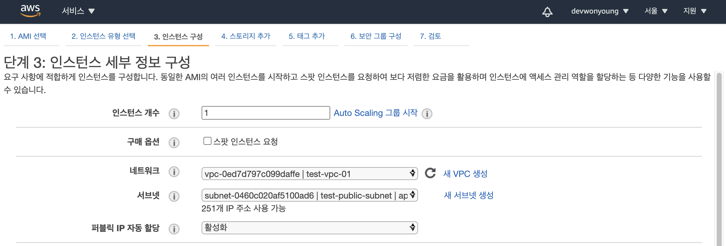 생성한 vpc, 서브넷을 선택합니다.