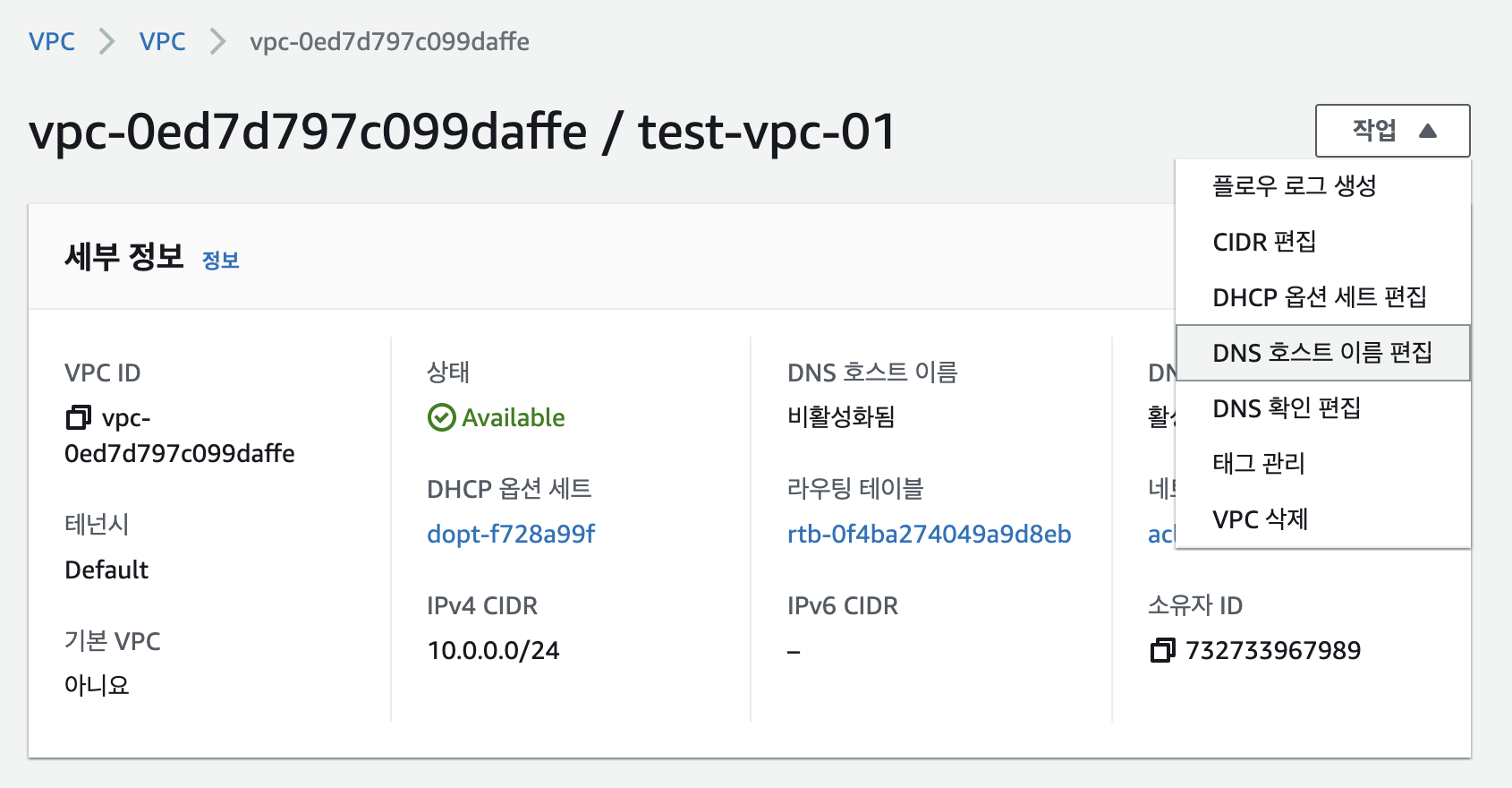 VPC생성이 완료되면 처음에는 DNS 호스트 이름이 비활성화됨 으로 설정되어 있습니다. 변경을 위해 작업>DNS호스트 이름 편집으로 이동합니다.
