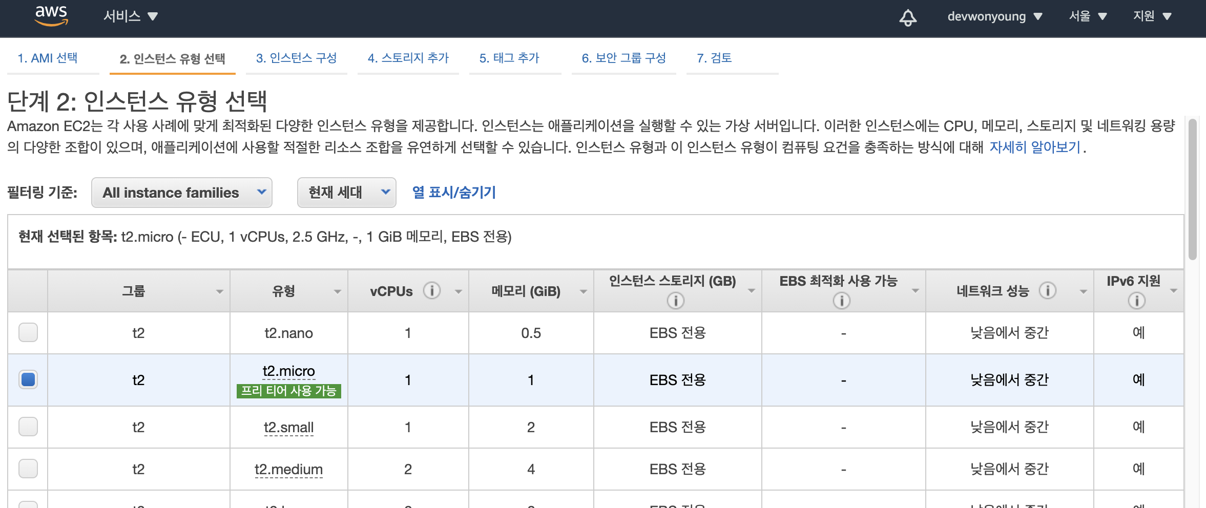 t2.micro를 선택합니다.
