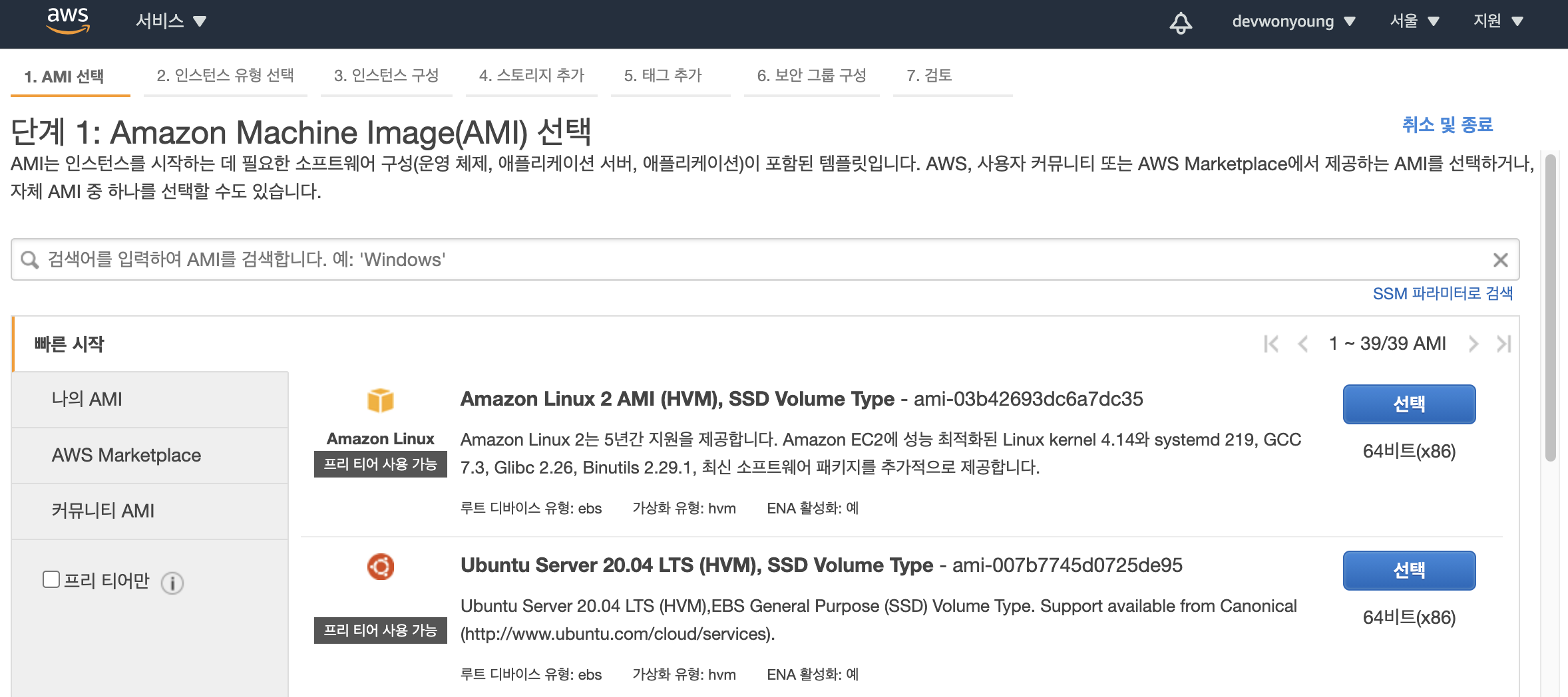 Amazon Linux 2 AMI를 선택합니다.