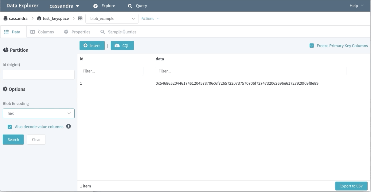 Explore 모드에서는 클러스터에서 필요한 쿼리를 날릴 저장소를 빠르게 찾을 수 있다. Explore 모드에서는 CRUD기능을 모두 제공하며 CSV로 데이터를 저장하거나 CQL insert statement를 다운받을 수도 있다. CQL을 추출하면 상용 환경의 데이터를 빠르게 테스트 환경으로 복제하여 사용할 수 있다.