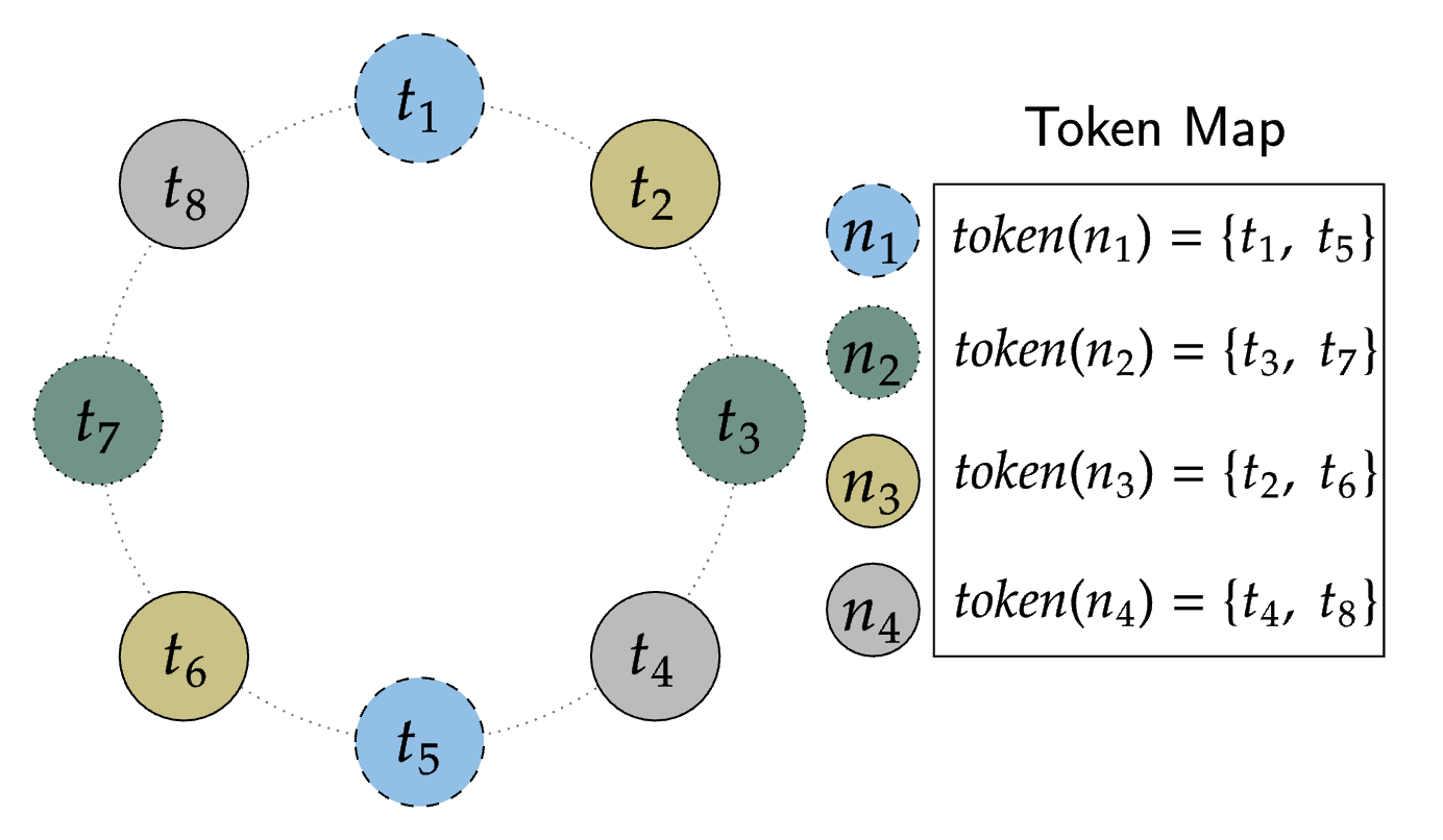 - 토큰 : 다이나모 스타일의 해시 링 단일 위치