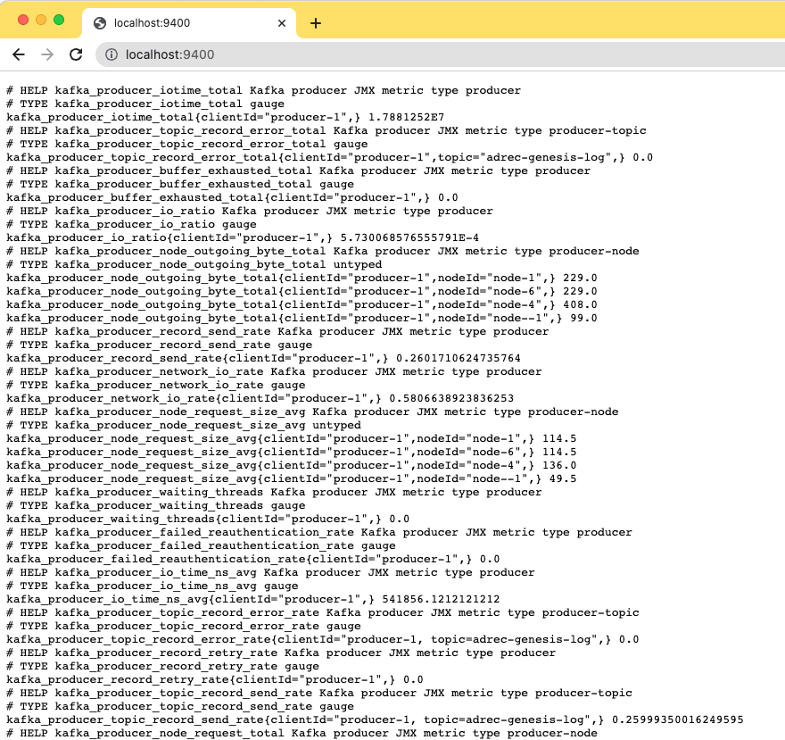 localhost:9400 엔드포인트로 접근하면 kafka producer 애플리케이션에서 jmx 데이터를 노출시키고 있는 것을 확인할 수 있습니다.